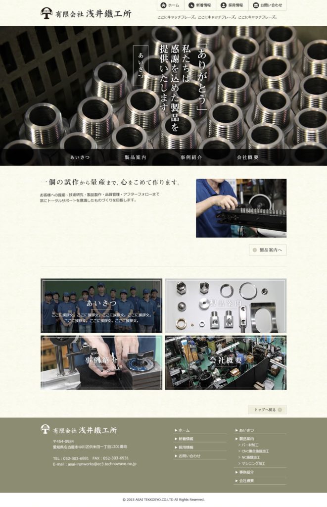 浅井鉄工所 制作期間 2015年07月〜2015年06月 各写真の彩度を少し下げ、プロフェッショナルなオーラを出しました。動画ファイルを埋め込み自動再生している下層ページもございます。(今はないようです。) https://asai-iron-works.jp/※サイトデザインが変わっているため、リンクは貼っておりません ← 過去の投稿へ 次の投稿へ →