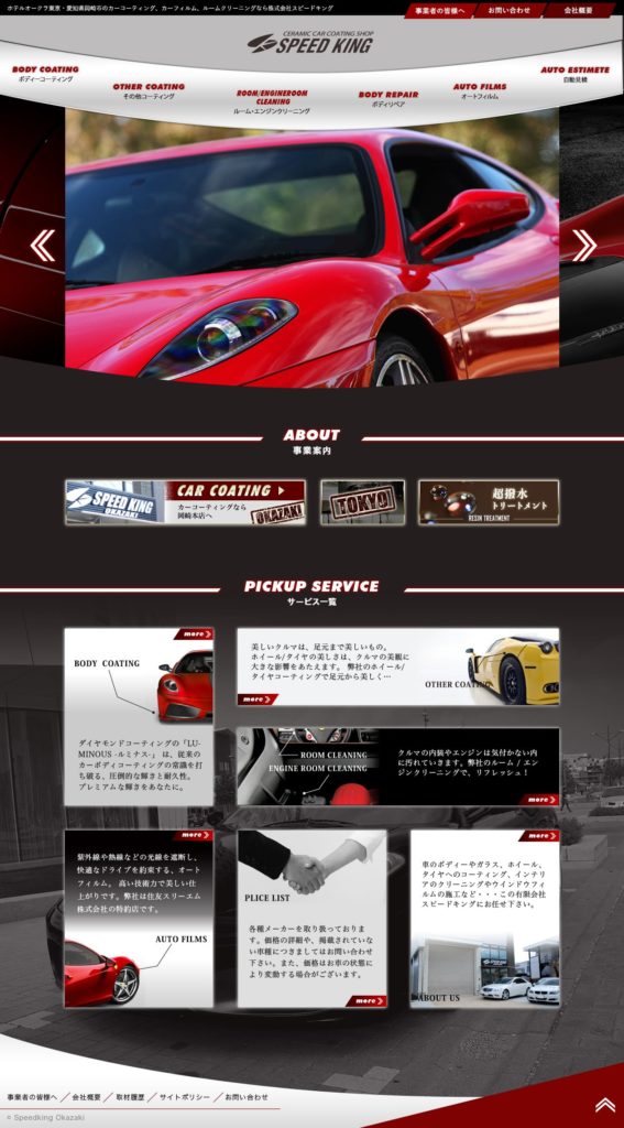 スピードキング 制作期間 2017年11月〜2017年12月 トップページのみリニューアルの案件です。コンテンツのボタンに光彩を加えることで、カーコーティング後の車の光沢具合をさりげなくアピールしてます。 http://www.speedking.co.jp/ ← 過去の投稿へ 次の投稿へ →