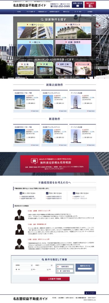 名古屋収益不動産ガイド 制作期間 2015年05月〜2015年06月 プログラマーが検索機能を作成している傍ら、デザインとコーディングを担当しました。レスポンシブ未対応です。ある程度画面をスクロールするとサイドメニューがついてくる仕様です。 nagoya-shuekiguide.jp※サイトは閉鎖しておりますので、リンクは貼っておりません。 ← 過去の投稿へ 次の投稿へ →
