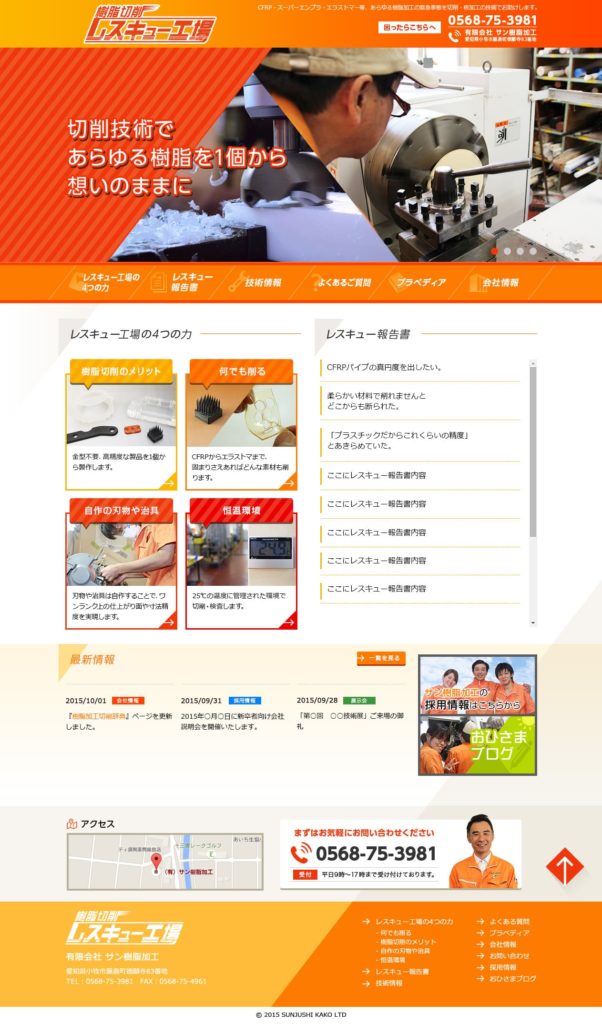 サン樹脂 制作期間 2015年10月〜2015年11月 レスポンシブなしのPCサイトです。「レスキュー」というキーワードからスピード感を連想したので斜めラインを活用しました。ロゴもそれっぽくデザインし、名刺にも使われているようです。 http://sunjushi.co.jp/ ← 過去の投稿へ 次の投稿へ →