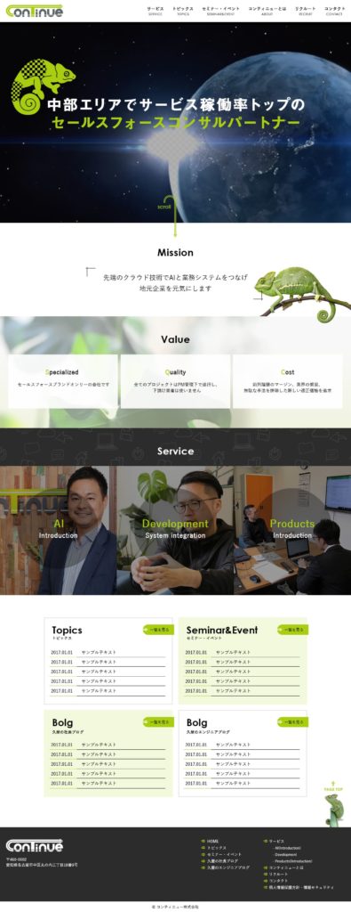 コンティニュー株式会社 制作期間 2018年01月〜2018年02月 最初のメインカラーはグリーンでしたが、2021年にブルーに修正させていただきました。クライアントのオフィスでカメレオンを飼っているらしく、トップに戻るボタンのカメレオンは遊び心で取り入れました。ブルーに変更する際「カメレオンもですか?」と聞いたら「左様」と回答がきたのでPhotoshopで色調補正しました。 https://continue-e.com/ ← 過去の投稿へ 次の投稿へ →