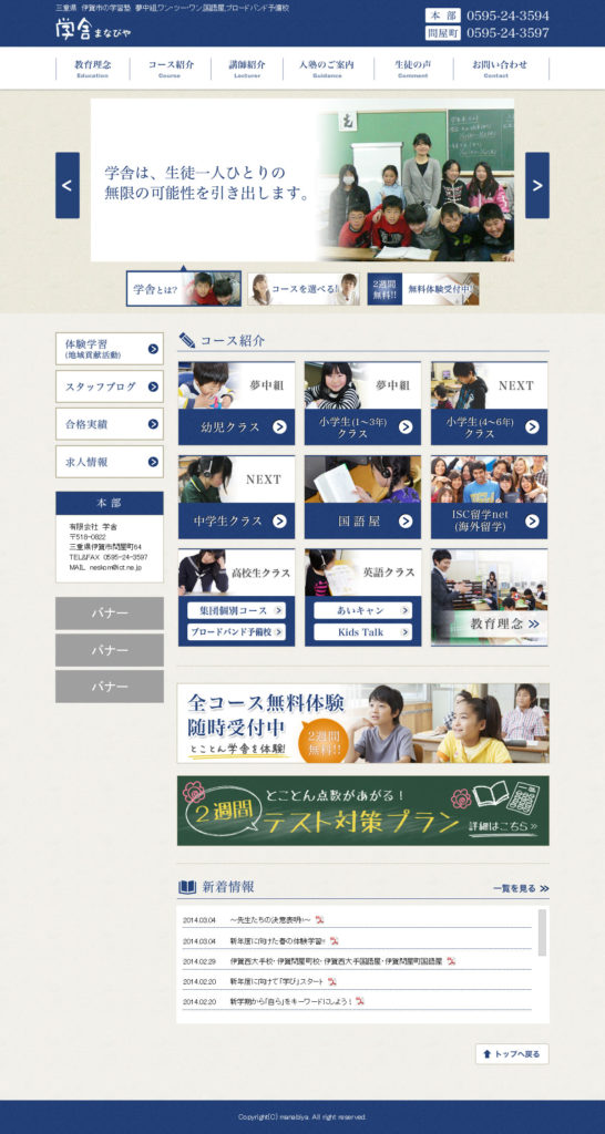学舎 制作期間 2014年04月〜2014年06月 当時はレスポンシブは主流ではなかったため、PCサイトのみです。社長のお知り合いのかたからの直案件とのことだったので、社長も交えてすり合わせをおこないました。別案件のLPを納品した後だったということもあり、頭の中が切り替えられえず下層ページがLPっぽくなっております…。 manabiya.info※サイトは閉鎖しているので、リンクは貼っておりません。 次の投稿へ →